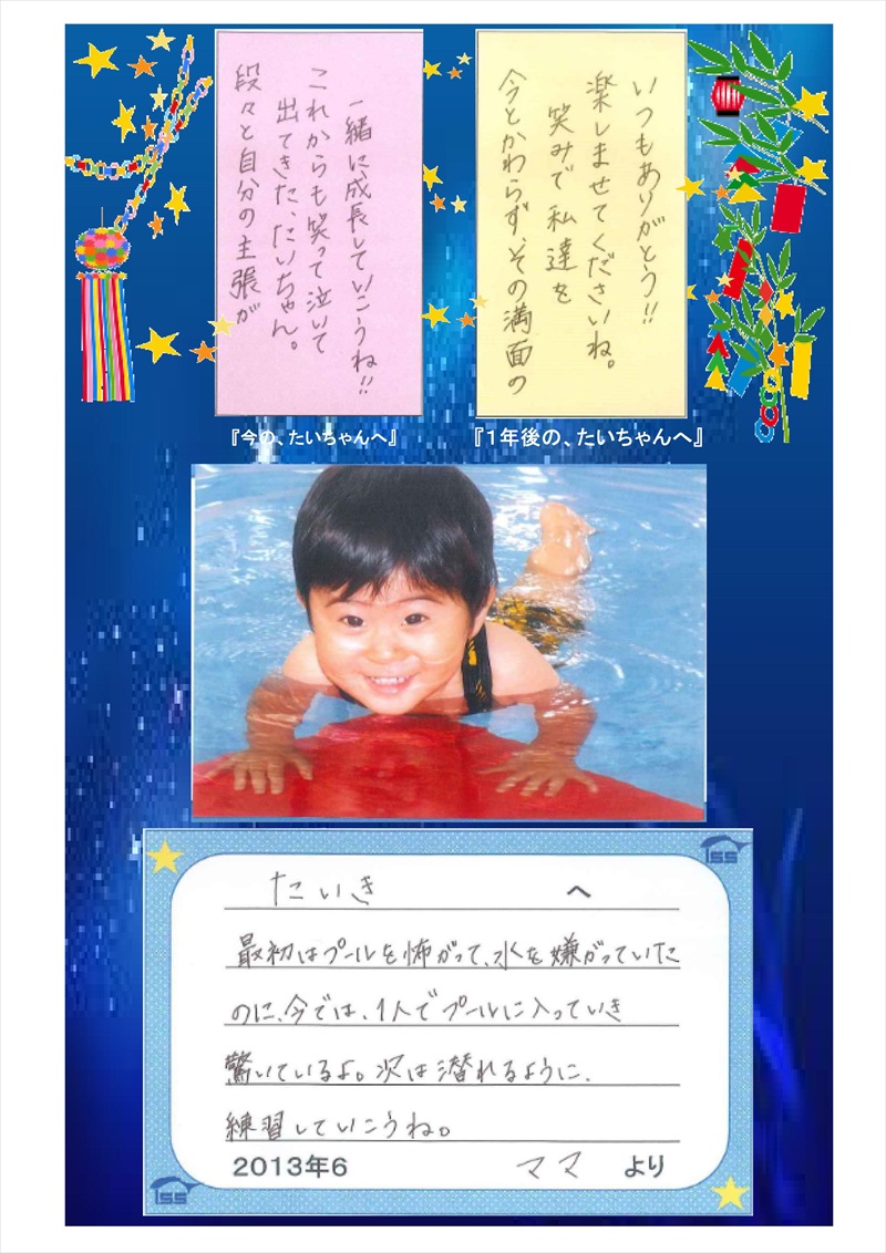 自己主張も出てきて、大変な時期になってきているのかもしれないけど、プールでは優しい笑顔でたいちゃんを見守っているママを見ていると たいちゃんの成長が嬉しくてしょうがないと言ってるように思えて ママの頑張りに先生はいつも感謝の気持ちでいっぱいです。