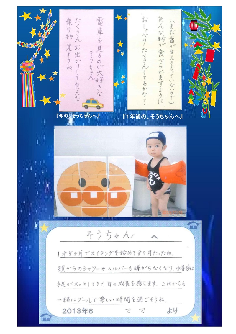 それと反面 『潜るよー!』と先生が言うと『嫌だ』の声も聴こえた時は“おっと自己主張!出た出た、いいぞ〜”これも成長と喜んでいます。 ママは大変かもしてないですが・・・・