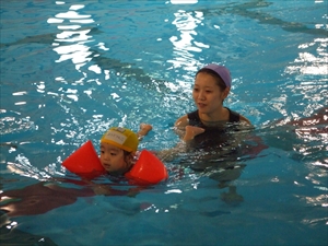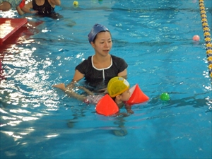 一人で浮いて頑張るベビーの姿にママも大喜び! 『すっごーい!』 『かっこいい!』 などいっぱい褒めてあげるとベビーのやる気スイッチは一気にON