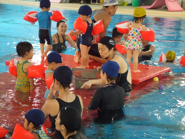 まだまだ小さな手のベビーにとって、水に漂うボールをつかむのはちょっと大変。 でも一生懸命手を伸ばしている間に一人でプカプカ〜・・・ “ あらっ水に浮いてバタバタできちゃった! ” そんな光景があちらこちらで見ることができました。