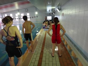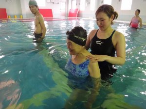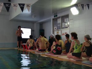 始めは詳しい説明を行い、その後実際にプールの中で「正しい姿勢」をキープしながらウォーキング!!