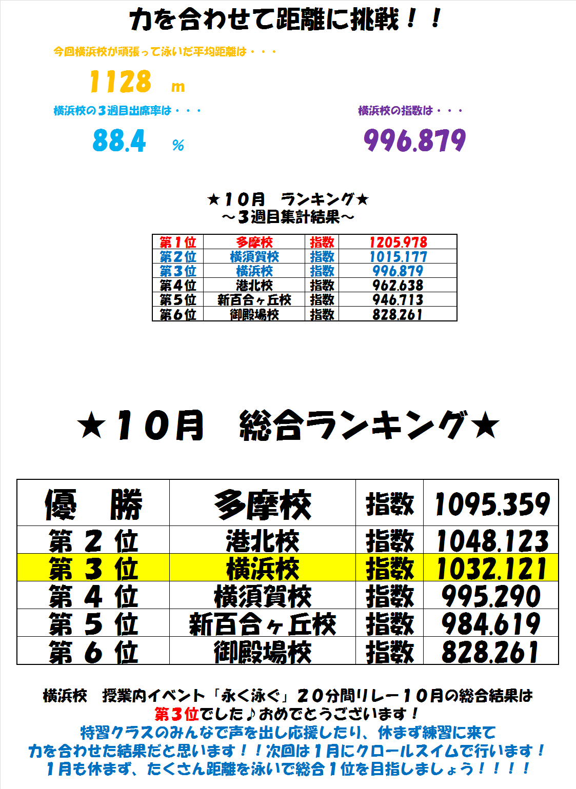 特習クラス授業内イベント 永く泳ぐ 3週目の結果及び総合結果報告