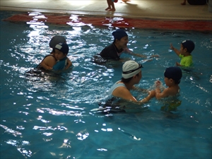 10月に練習を行った水慣れ基本種目や手遊び歌などを歌に合わせて行うことで楽しみながら水の中で体を動かすことに慣れたり、水を理解させてあげるようにしていきます。