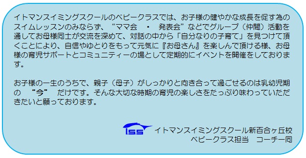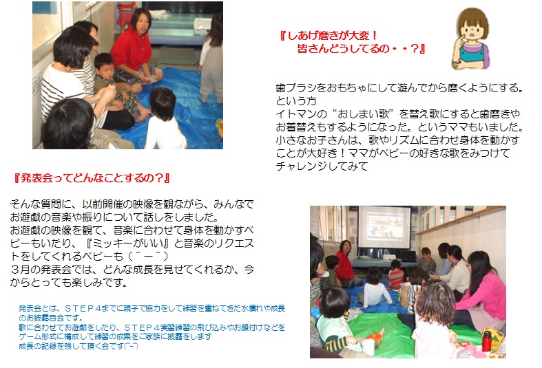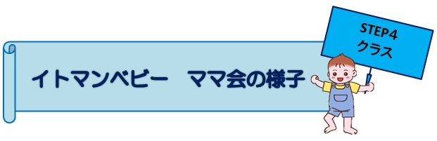 次のSTEPの話しやトイレトレーニングなど、今まさに直面している悩みについて話をすると 『うちの子も〜』 『そうそう〜』 など周りのママたちと同意の声に 『みんな一緒なんだ〜』 とちょっと安心する場面もあり、同じ月齢のお子様を子育て中のお母様同士やレッスン担当コーチと話をしながら、とても和やかなママ会となりました。