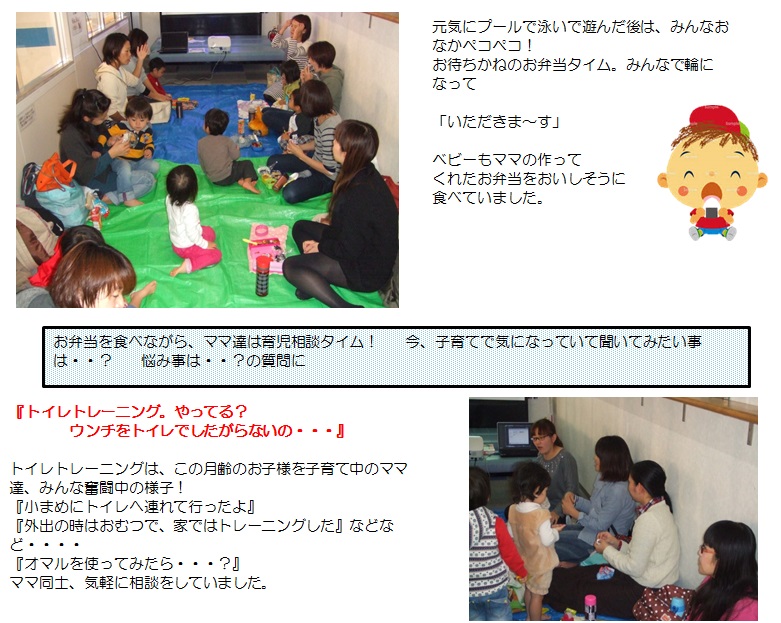 練習後の水分補給や栄養補給を行いながら、お子様の日常生活の様子や、ちょっとした育児の悩みにお得情報など様々・・・・