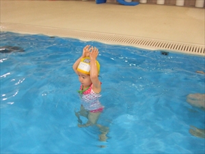 最初は、新しい環境である幼児用プールに入るのを断固拒否をするベビー