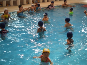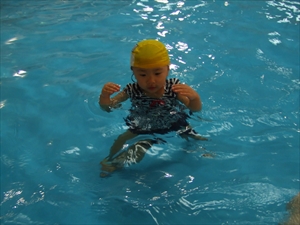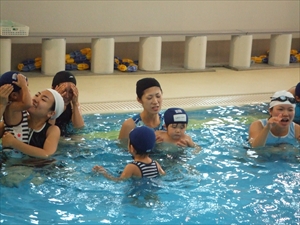 歌に合わせて鳥やウサギといったベビーちゃんにも分かりやすい動物のまねっこ遊びで水の中を自由に動き、遊ぶ楽しさを感じていただく為に練習を行いました。