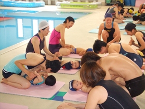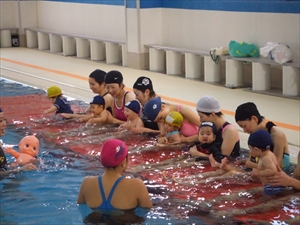 最初は水の中での補助に戸惑い、ぎこちなかったママやパパも徐々に慣れてきて、ベビーも安心して入水できるようになってきたようです。