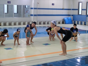 ママと一緒に並んで「1・2 3・4」屈伸体操