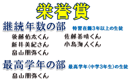 特習記録会では、下記の生徒に努力が称えられ、楯と賞状が贈呈されます。