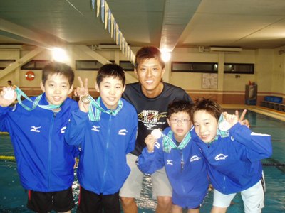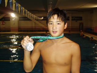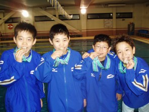 中でも津村航平君が13〜14歳区分の男子200m背泳ぎで2位、原尚稔君、田中雄君、橋場貫君、橋場健君が10歳以下男子200mリレーで2位と見事銀メダルを獲得しました![]()