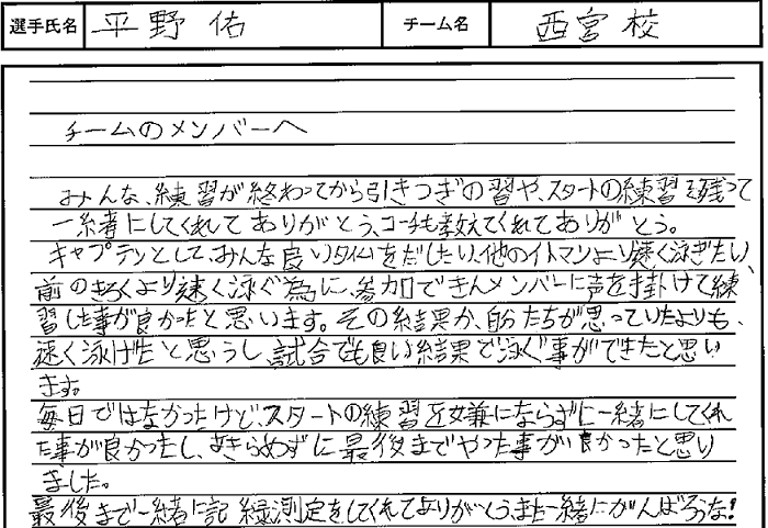 各リレーチームのリーダーの感想文を掲載いたしました。