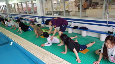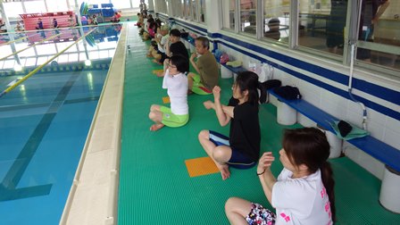 まずは、プールサイドでストレッチの講習です★