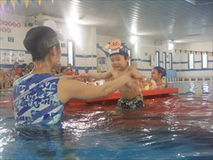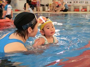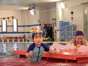 この月齢は、保護者を介してお友だちと遊べるようになったり、お気に入りのお友だちが出来たりと、社会性も芽生えてくるので、お友だちの真似をして顔を水につけたり、泳いだりと様々な成長の姿も見せてくれました。