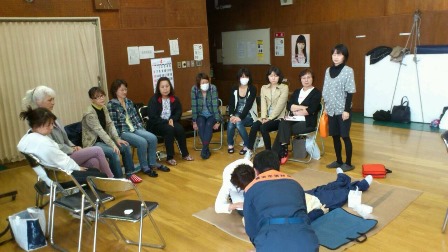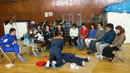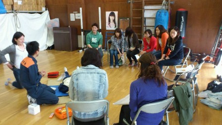 人形を使って、心臓マッサージ・人工呼吸・AEDの使用方法などを実際に行いました。