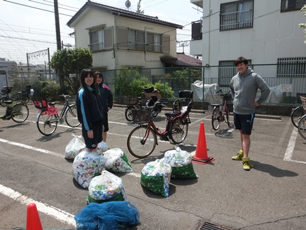 集まった7袋のエコキャップを、第二駐輪場まで運びました♪