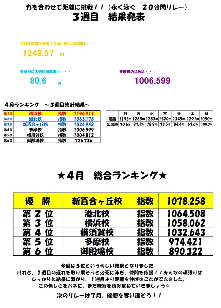 【特習クラス】永く泳ぐ 4月 総合結果 発表!!