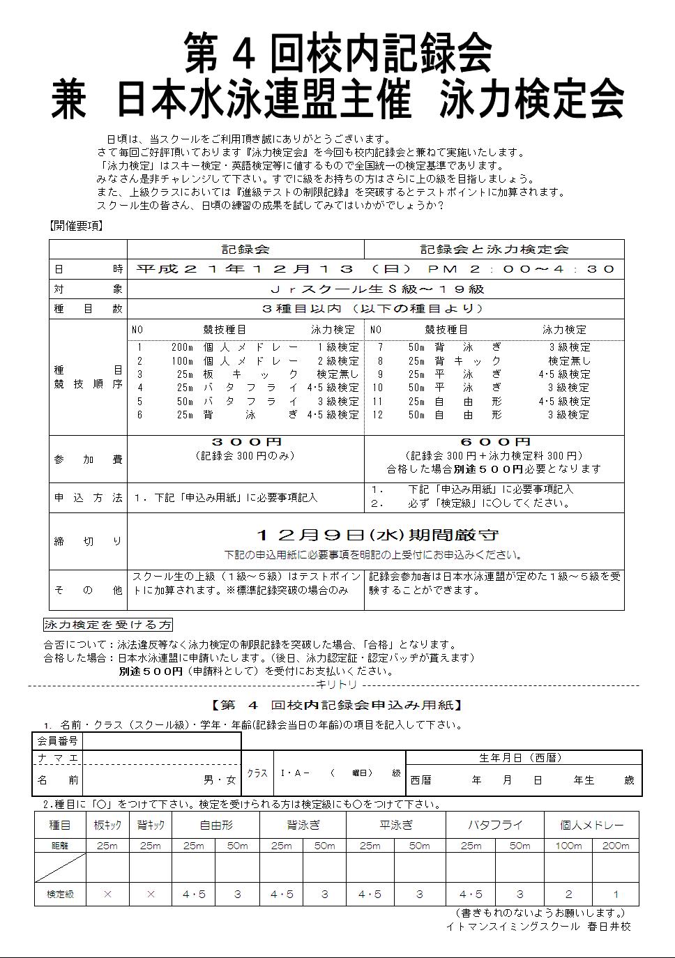 エントリーする種目・泳力検定を受けられる方は検定級に〇を付け、 フロントにてお申し込み下さい。