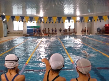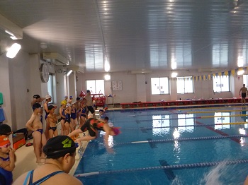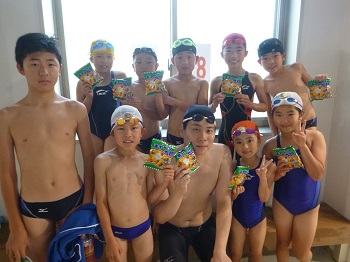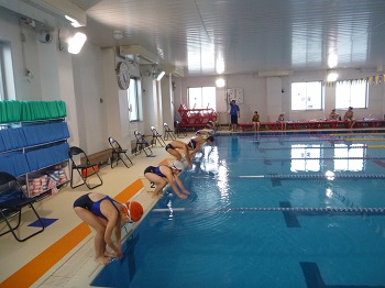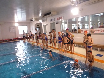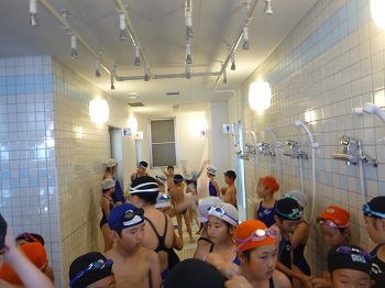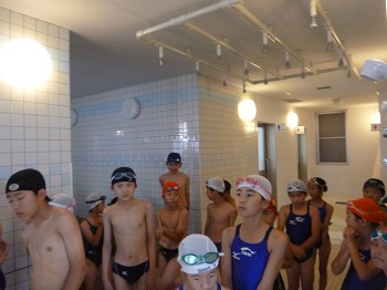 泳ぐ前は、シャワー前の招集所で 「ワイワイ」