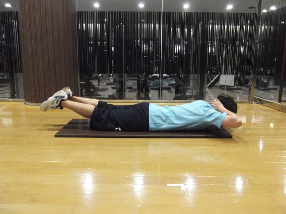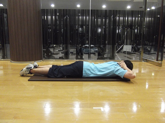 1・うつ伏せに寝転び、両手を頭の後ろで組みます