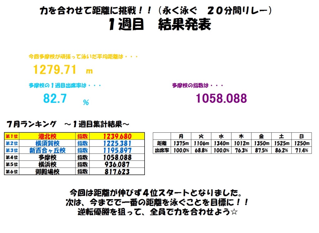 【特習クラス】永く泳ぐ 7月1週目 結果発表