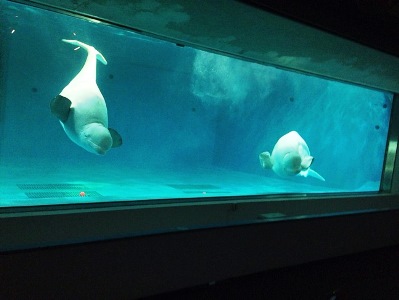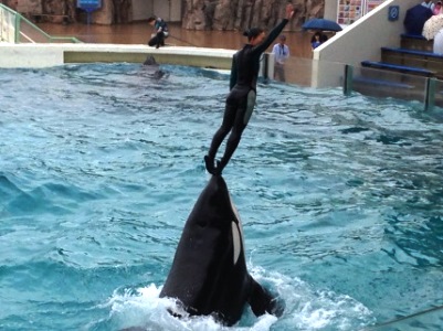 背中にお姉さんを乗せて泳いだりシャチの口先?鼻先?にお姉さんが立って