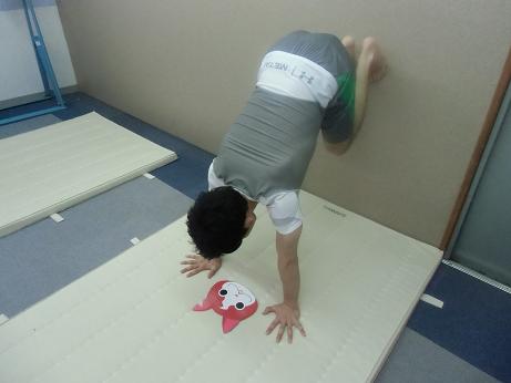 3、足を壁の低い所から乗せ、両足をできる所まであげる。(膝はしっかり曲げておいて)