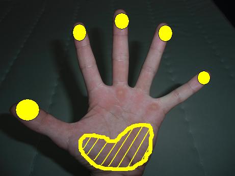 2、黄色→頭の後ろの方(後頭部)をつく。
