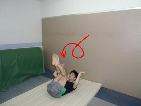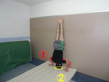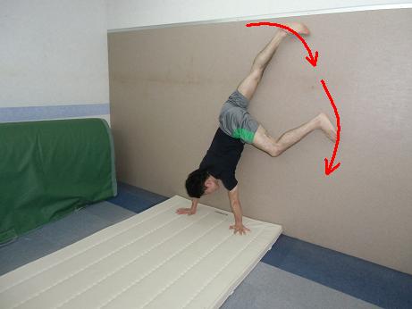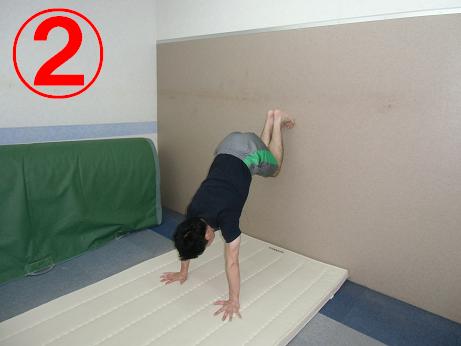 2、両足を壁に着け、前回のだんご倒立(第3回目授業)の姿勢。