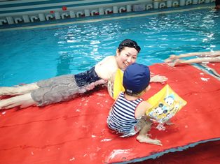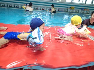 このクラスではアームヘルパー(浮き具)をつけての水遊びも行なっています。
