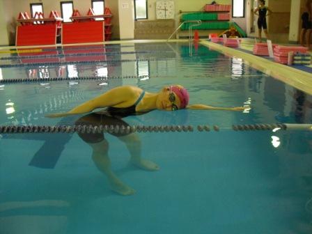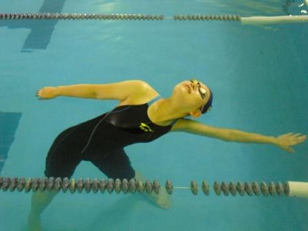 プールサイドやコースロープを目印にすると、目線を低くアゴを引いた状態で呼吸動作がしやすくなります。