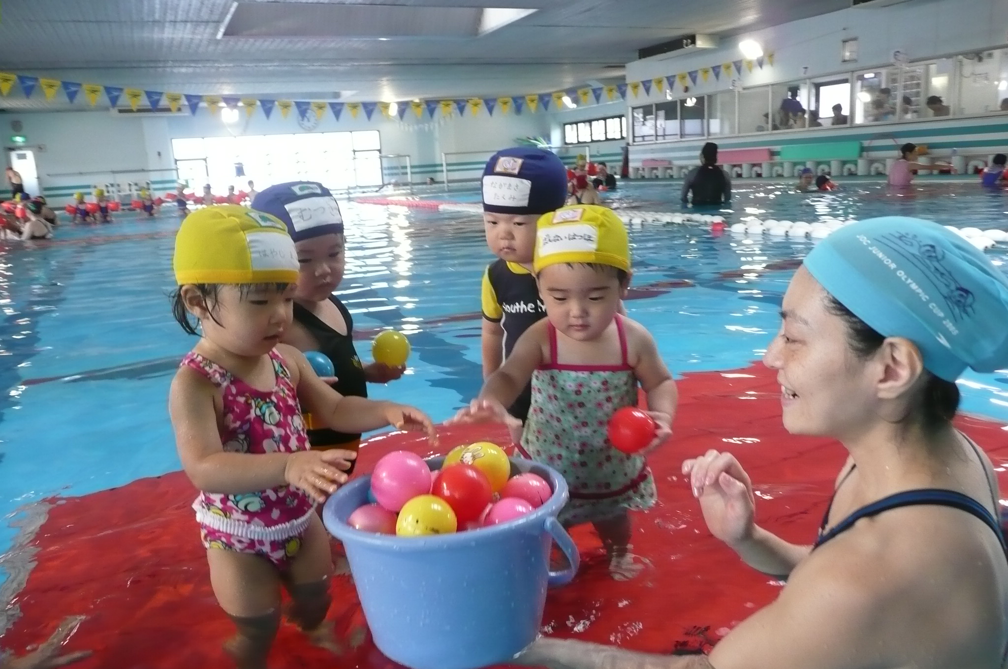 みんなお水が大好きで、プールに入った瞬間のお顔はとびっきり輝いていて、その笑顔を見ているママ達の笑顔も負けていません♪ (写真に納められなくて残念っ!!)