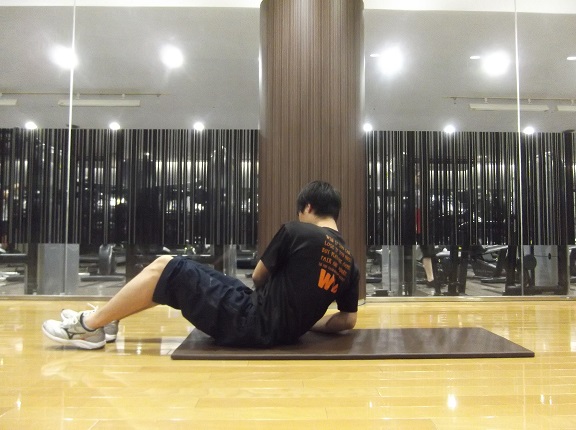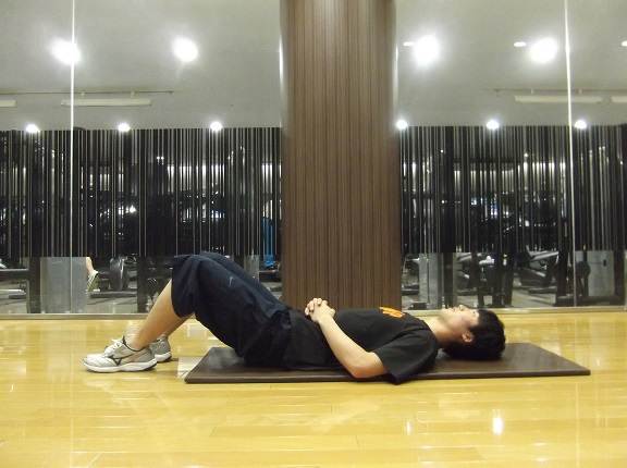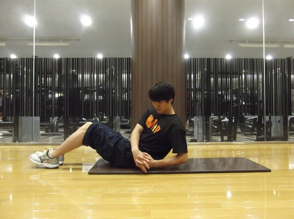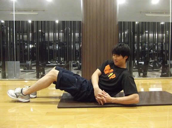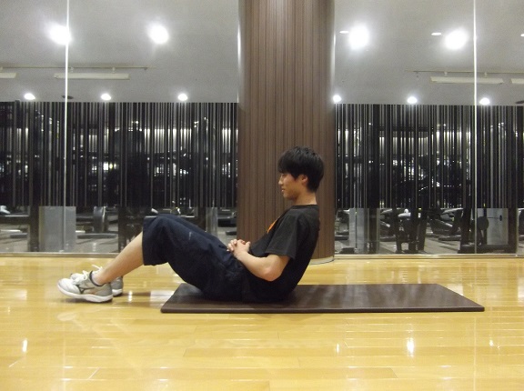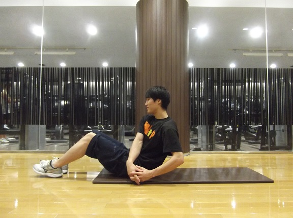 2・お腹の上で手を組み、上体を60度くらい起こします