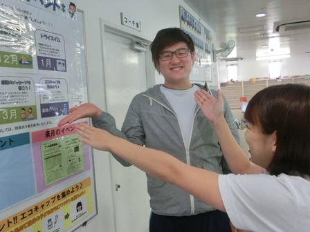 ポスターを見ていた佐竹先生に、「ポスターを紹介してる感じで写真撮りたい!」と