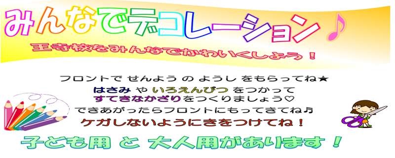 こんにちは\(^o^)/みなさん、いま王寺校ではみんなのステキなかざりを飾っています★フロントに専用の紙を置いてありますのでケガをしないように気を付けてステキなかざりを作ってくださいね♪