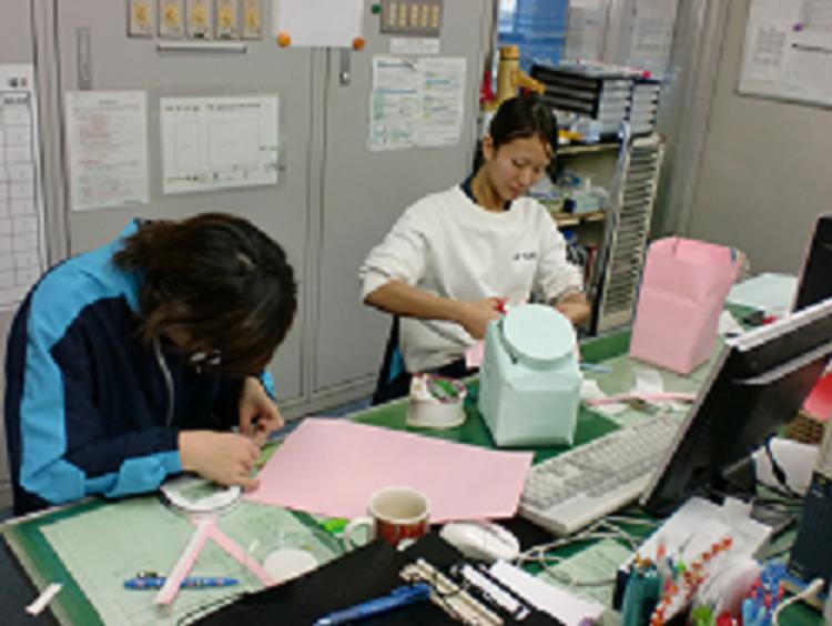 くじ引きのボックスを作る竹田先生と森先生。