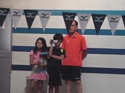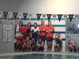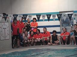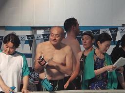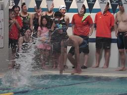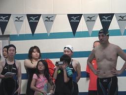 お母さんが泳ぐのを真剣に応援・撮影する兄妹