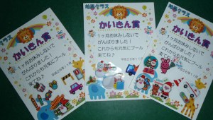 在籍曜日で1ヶ月お休みしないでプールに来たお友達にはかわいいシール付き賞状をプレゼント