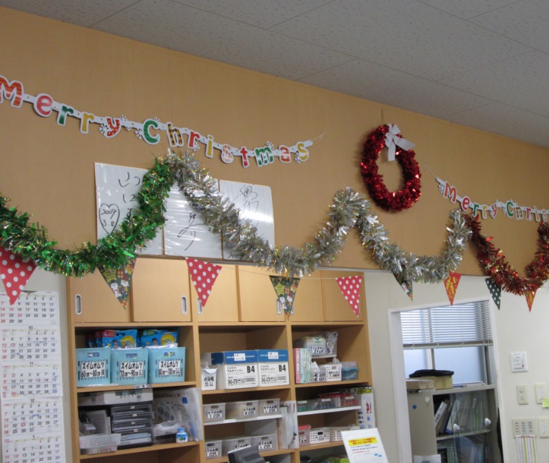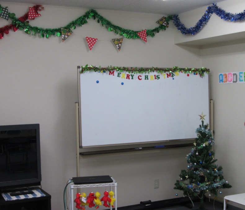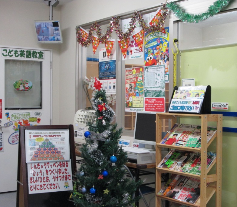 こんにちわ!フロントと、こども英語塾教室のクリスマスの飾りつけを