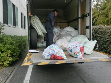 回収トラックの中には、学校や施設から集まったエコキャップがたくさん積まれていました!