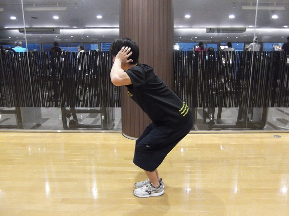 2・イスに腰かけるように、後方にお尻を突出し膝を少し曲げていきます
