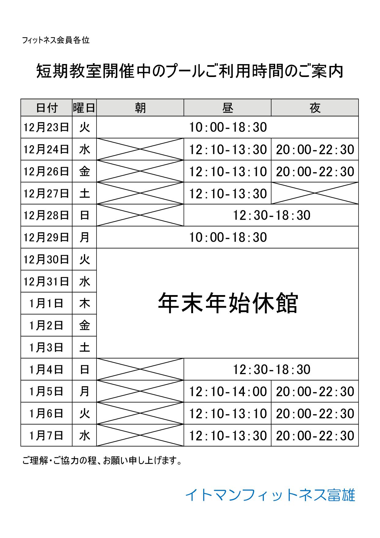【フィットネス会員様】12月23日(火)以降のフリースイミング時間変更について