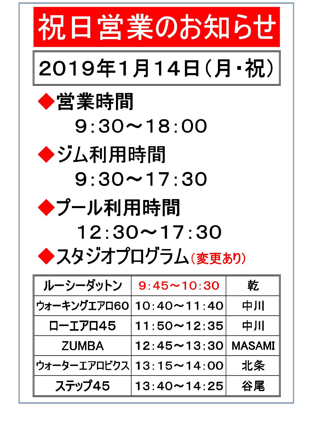 1月12日(月・祝)のフィットネス営業時間変更