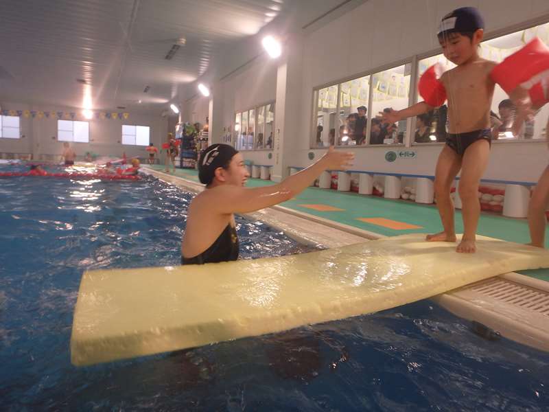 ゆらゆら揺れるロングキック板の上を