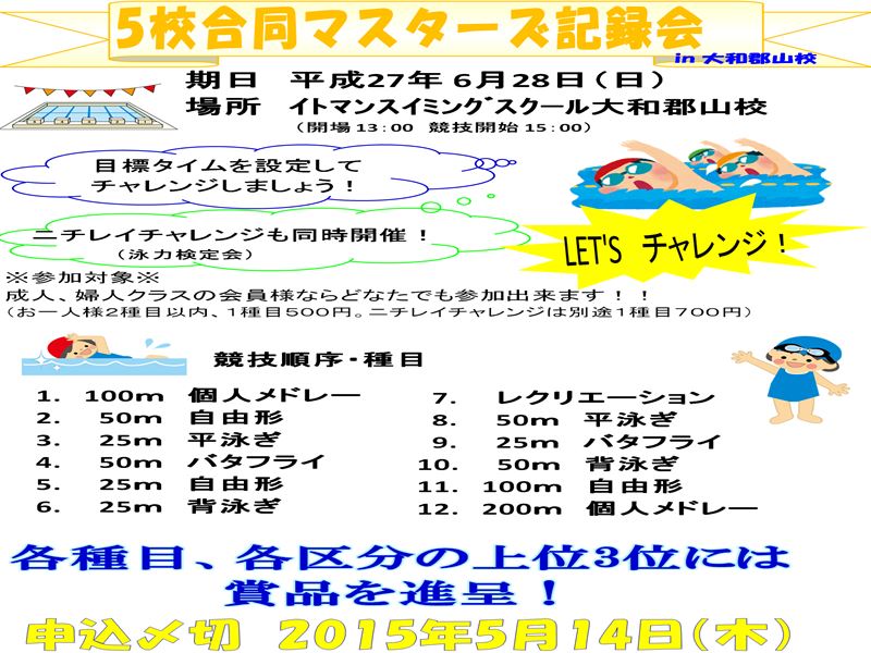 ★参加者大募集中★婦人クラス・成人クラスの会員様!みなさん、新しいことに挑戦してみませんか?おともだちを誘って挑戦してみてください!ぜひ、みなさんご一緒に5校合同マスターズ記録会へ出場しましょう(^^)/マスターズ登録は不要です♪参加者にはこの記録会限定の素敵な参加賞があります!ぜひ、みなさんご一緒に出場しましょう!詳しくはお手紙または、館内のポスターをご覧ください☆