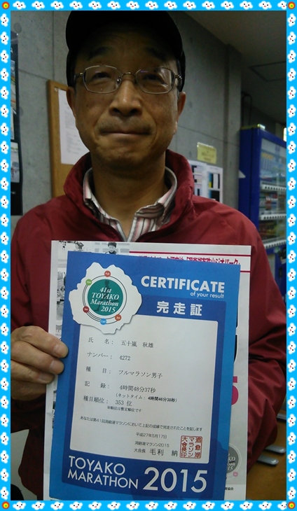 僕からすると、フルマラソンを普通に完走すること自体、ほんとうにすごい事だと思います。五十嵐さん、お疲れ様でした!!
