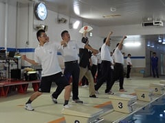 大会長のあいさつが終わるかと思いきや、各スクールの主任コーチが呼ばれ、気合いの「がんばるぞ!!」宣言をすることに![]()