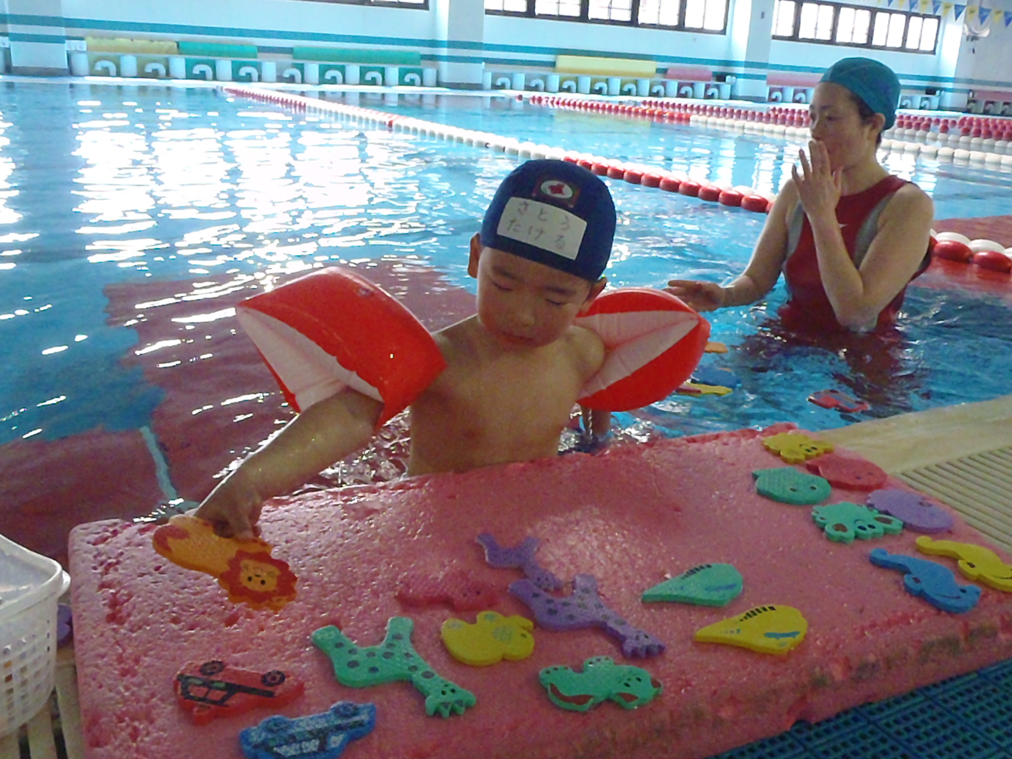 プールに浮いているシールを取って、海の生き物・乗り物・動物の種類に分けて遊んだり、大きなプールを目一杯使った遊びをしました♪