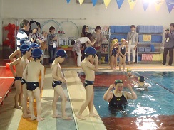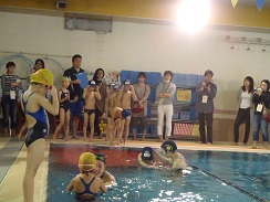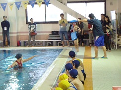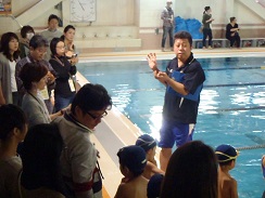 実際に子供たちの泳ぐ姿を見ながら泳法についての説明を行いました![]()