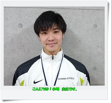 小峰君は、就職が決まり、2月いっぱいでイトマンを退職しました。非常に優しく、思いやりのある人間で、おっとりはしているけれど、まじめでしっかりとした性格のトレーナーでした★これからのステージでも、きっと、さらに成長して男前になってくることでしょう♪活躍を期待しております★がんばれ小峰トレーナー!!
